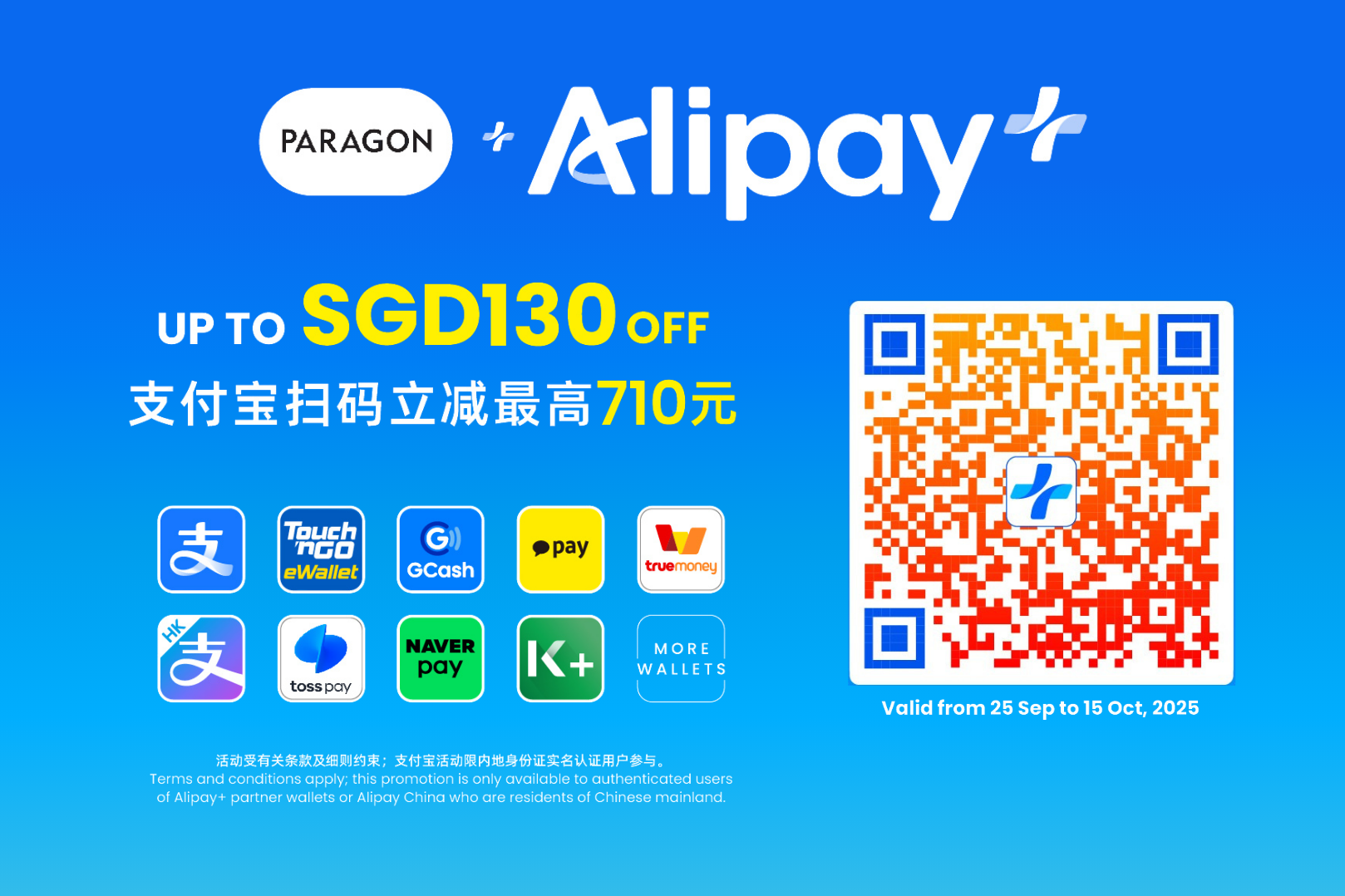 Spend SGD1,800 in a single receipt using Alipay and receive SGD100 Paragon mall vouchers!
