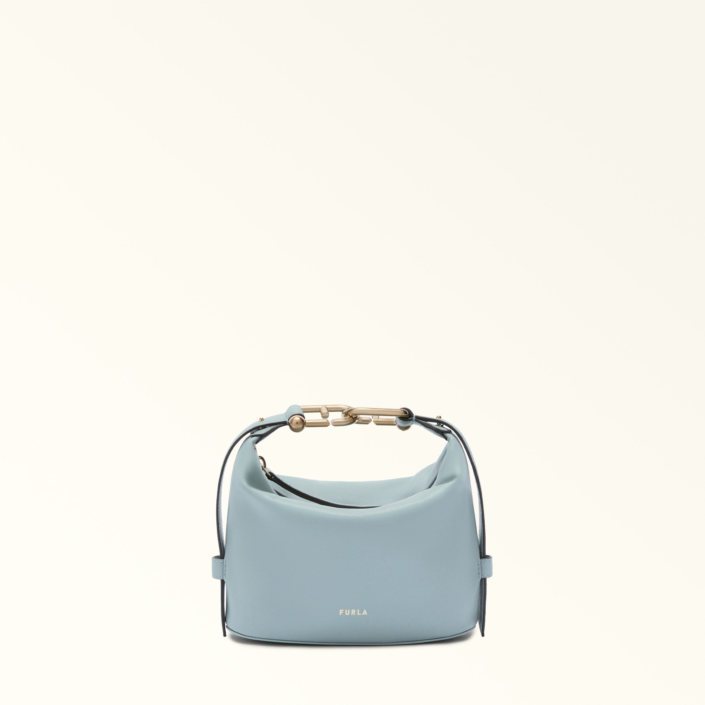 The small Furla Nuvola handbag is styled in soft leather with a natural grained finish. The rounded shape is accompanied by a top handle held together by two interlocking Arcosfera hardware accessories that combine the iconic Furla Arch logo with the brand’s original spherical hall mark. Perfect as a top-handle bag, it can also be worn crossbody with a matching shoulder strap.
