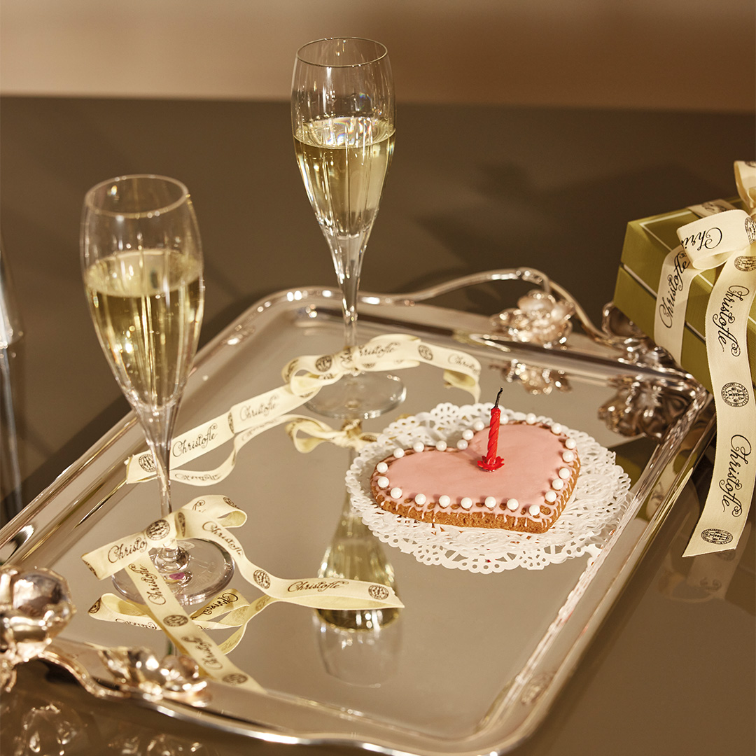银莲花镀银长方形托盘,配有两个立体莲花手柄,其造型源自盛放的银莲花。尺寸恰到好处,适合呈上开胃小菜或饮品。银莲花 – 美好年代系列,是对新艺术运动的现代演绎。它以精雕细琢的银莲花盛开图案为特色,其设计灵感取自20世纪初装饰玻璃工匠埃米尔·加莱(Émile Gallé)为巴黎之花香槟(Perrier-Jouët)酒瓶所设计的花卉元素。